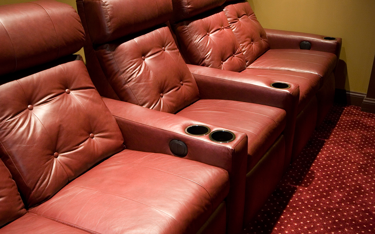 Even a compact space can be made to feel grand! This traditional theater is done in rich red with gold accents. The metallic gold screenprinting on the acoustic panels is a notable detail. Custom tufted doors create a classy entrance, even with the space-conscious tiled entry.
