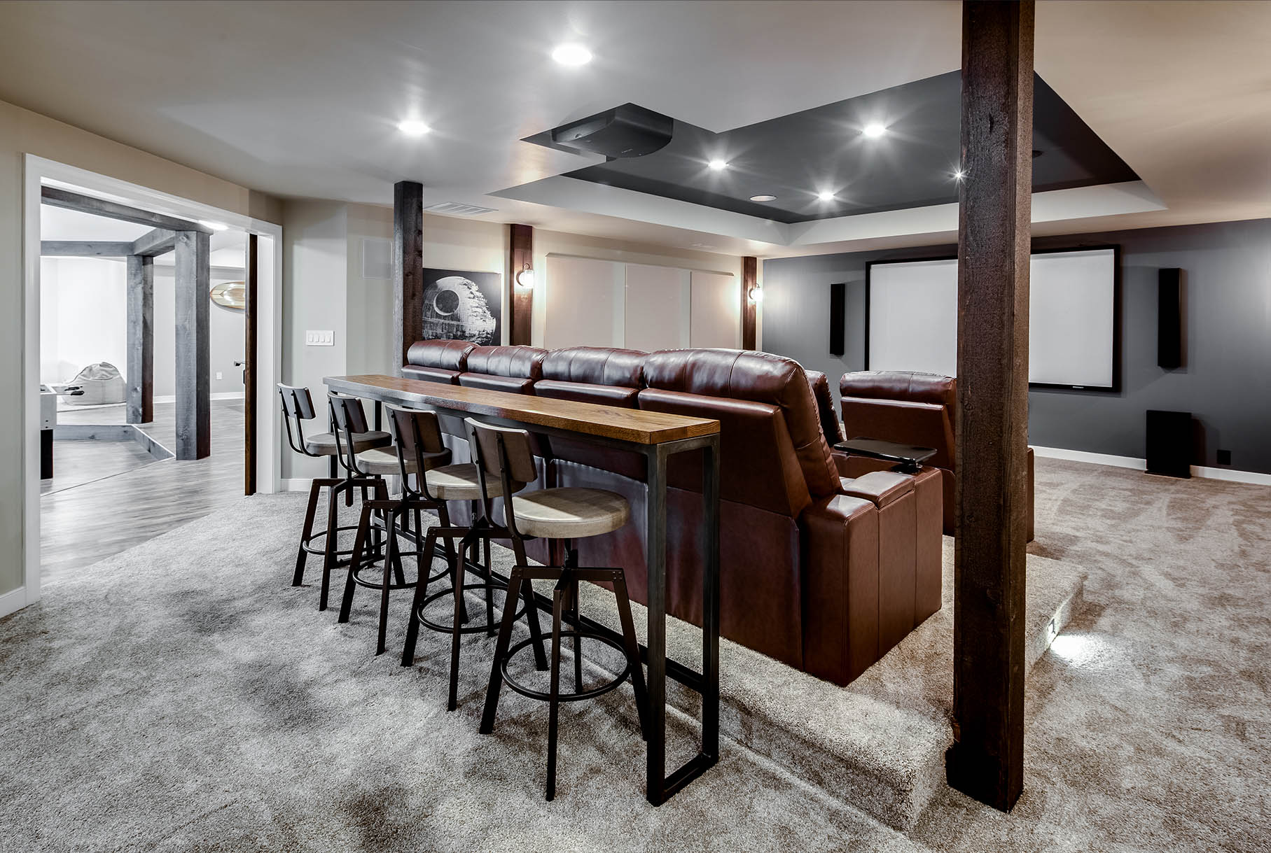 We equipped the home theater with a Sony 4K UHD projector, a 110-inch screen, and Dolby Atmos Surround Sound System featuring Totem Acoustics on-wall and in-wall/ceiling speakers, finished off with cozy leather recliners. The custom-made bar got dressed in lightly stained brick and beautiful countertops. The dark wooden beams and double barn doors support the warm yet open concept and allow privacy when needed. We then built out a guest room, bathroom and were able to modify the utility room into a gym with glass doors for an unobstructed view onto the screen while working out – everything entirely created from scratch!