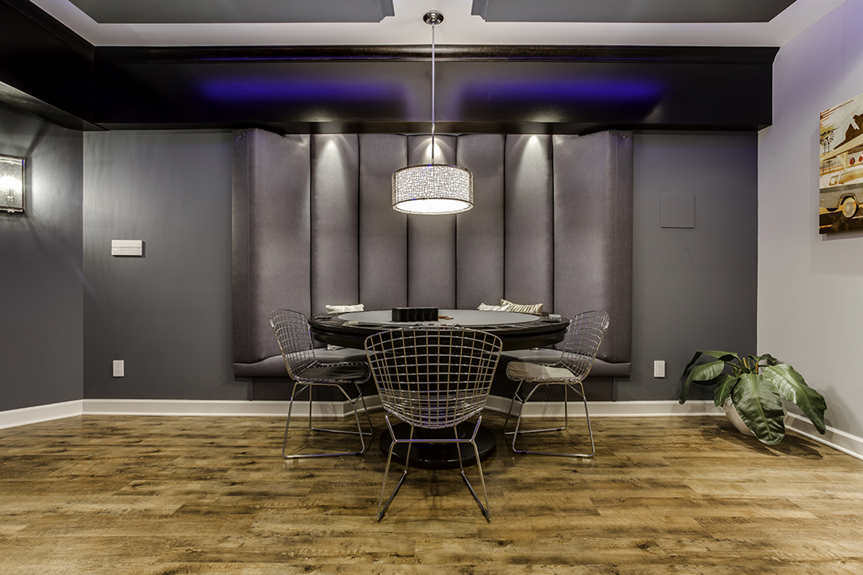 Our client wanted the Gramophone team to recreate an existing finished section of their basement, as well as some unfinished areas, into a multifunctional open floor plan design. Challenges included several lally columns as well as varying ceiling heights, but with teamwork and communication, we made this project a streamlined, clean, contemporary success. The art in the space was selected by none other than the client and his family members to give the space a personal touch!
